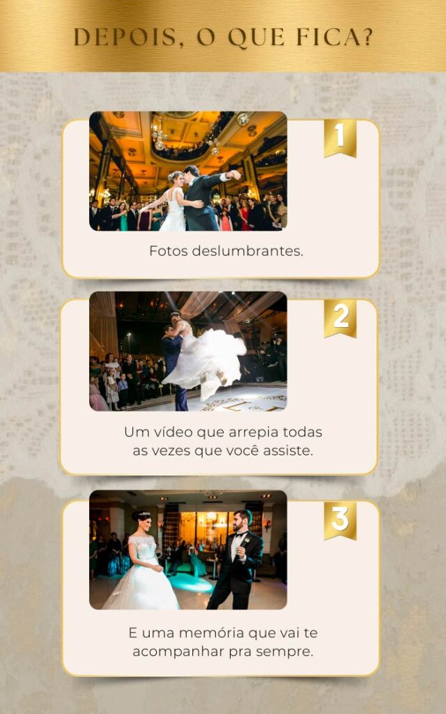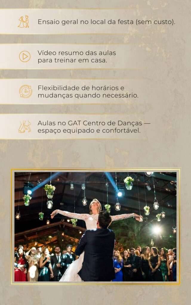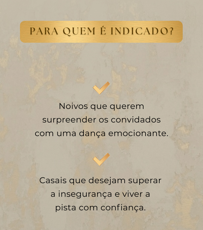 Não é só uma dança. É o momento mais esperado da festa. A primeira dança é o símbolo da união de vocês — e merece ser vivida com emoção, segurança e beleza. É um presente para os convidados!!