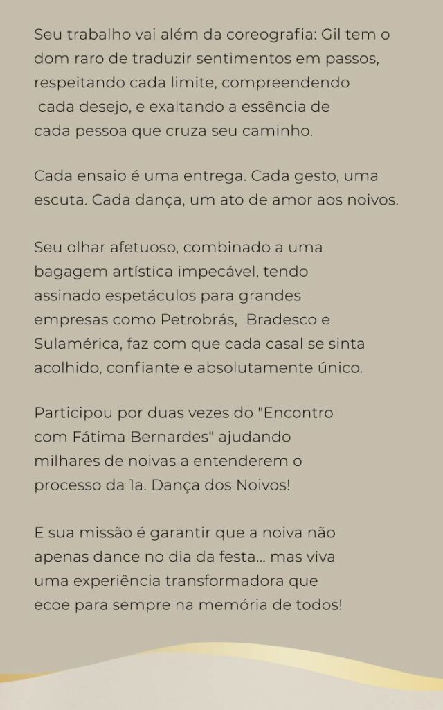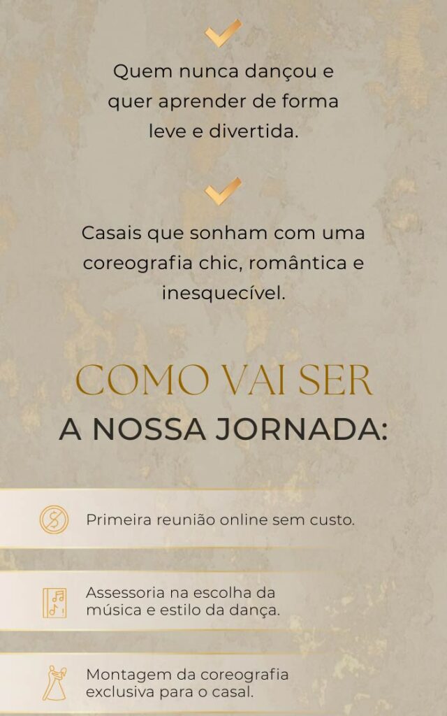 A dança vai refletir quem vocês são. Nada forçado, nada desconfortável. Eu capto o estilo do casal e transformo isso em uma coreografia leve, elegante e autêntica.